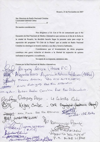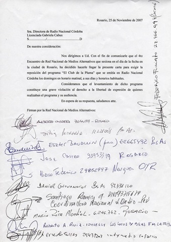Enviamos este documento a fin de que sea difundido por ustedes, el mismo ha sido elaborado y firmado en el marco del Encuentro Nacional de Medios Alternativos, en la ciudad de Rosario los 24 y 25 de Noviembre.
